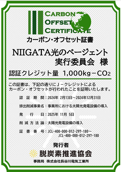 今回、『脱炭素推進協会』様のご厚意により、『新潟産の環境クレジット』をNIIGATA光のページェントにご協賛いただけることになりました。